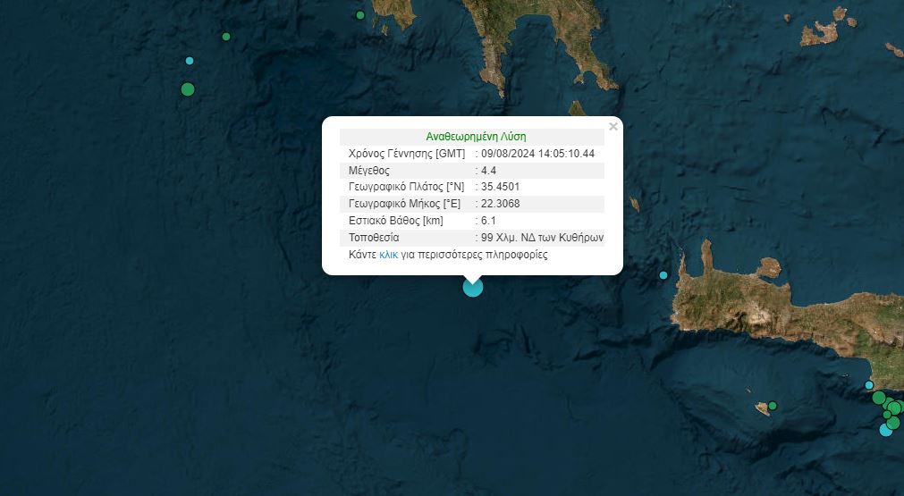 Σεισμική δόνηση στη θαλάσσια περιοχή, ανοικτά των Κυθήρων σημειώθηκε λίγο μετά τις 5 το απόγευμα της Παρασκευής