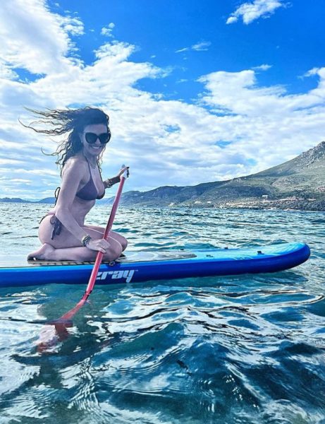 Μάλιστα, φαίνεται να δοκίμασε και τις ικανότητες της στο SUP, παρά τους ισχυρούς ανέμους που έπνεαν.