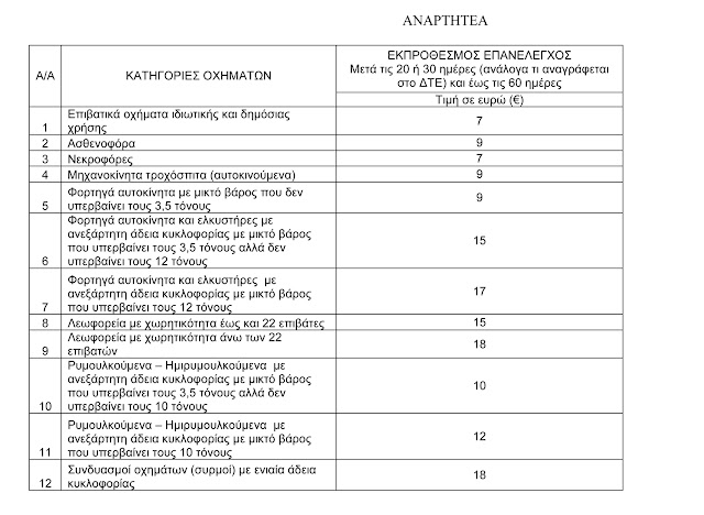 Με τη νέα νομοθεσία για τα Ι.Χ. επιβατικά οχήματα ιδιωτικής και δημόσιας χρήσης αν η καθυστερημένη προσέλευση δεν υπερβεί τις 30 ημέρες το παράβολο ανέρχεται σε 16 ευρώ, ενώ για καθυστέρηση από 30 ημέρες έως 6 μήνες το νέο πρόστιμο αυξάνεται στα 33 ευρώ. Το παράβολο, ωστόσο, αυξάνεται σημαντικά εάν η καθυστέρηση τεχνικού ελέγχου υπερβεί τους 6 μήνες, καθώς τότε διαμορφώνεται στα 65 ευρώ.